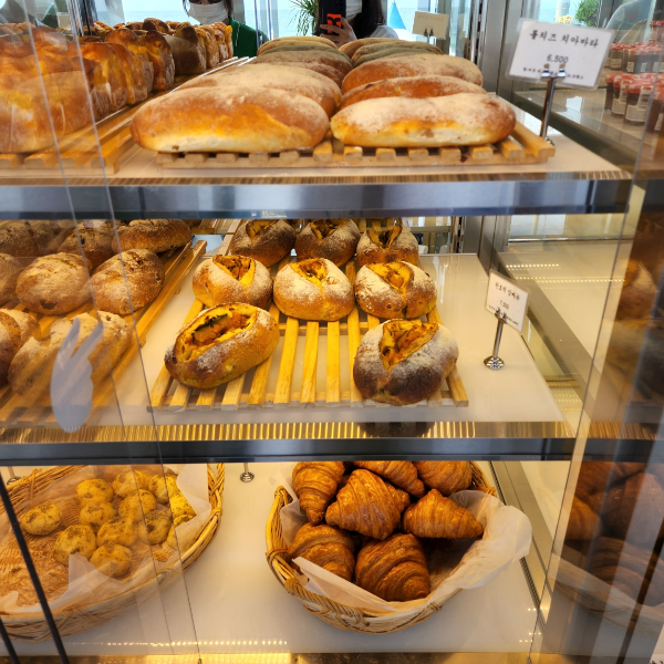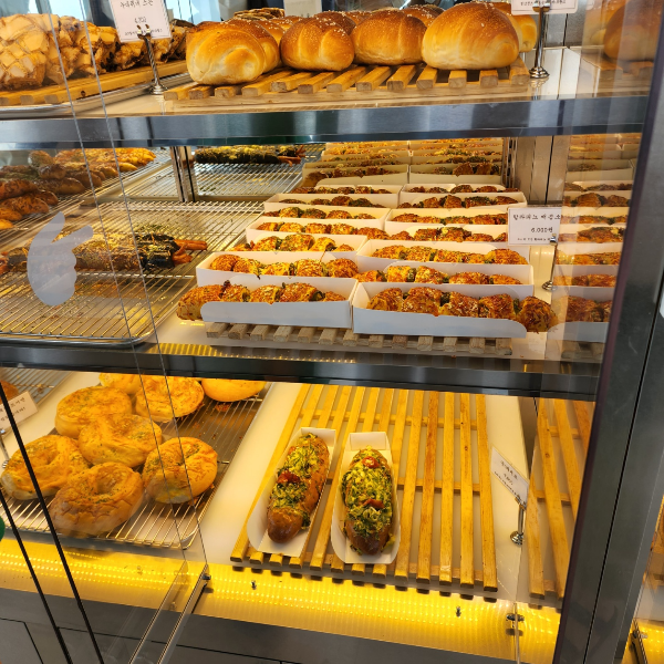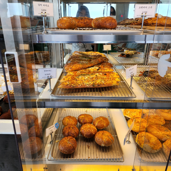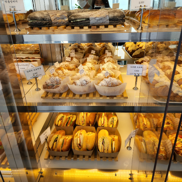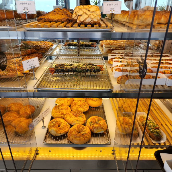 곳 카페에서 감동받은 부분이 있는데, 빵들이 많아서 3단 서랍장처럼 해놓은 것도 있겠지만 유리 진열장에 있는 빵들 보고 감탄받았어요. 그리고 문이 자동문으로 열려서 제가 꺼내고 싶을 때 눌러서 빵을 꺼내서 담으면 되요. 보면서 진짜 '와~!'소리 절로 나왔어요. 처음에 문을 어떻게 열어야 할지 몰라서 다른 사람들 하는 거 보고 눈치로 배웠습니다.