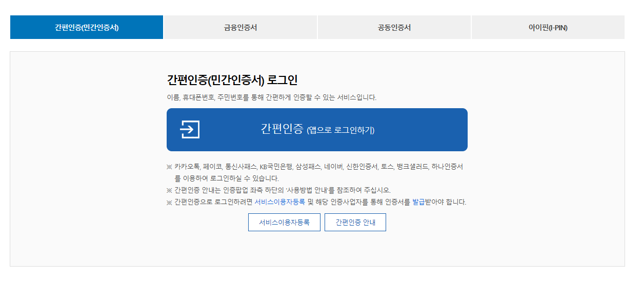 로그인은 간편인증(민간인증서), 금융인증서, 공동인증서, 아이핀등이 있습니다.