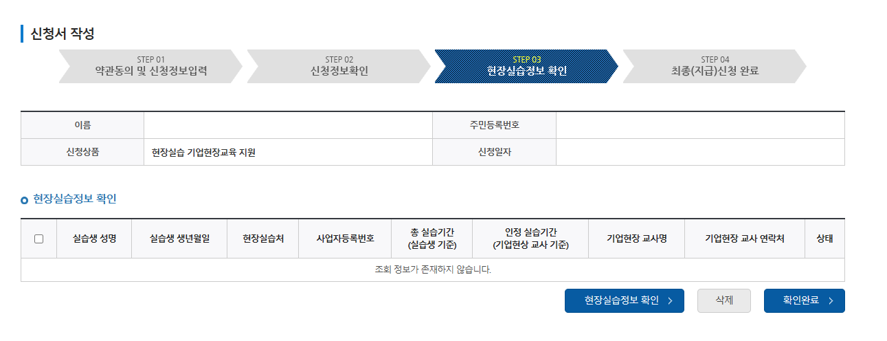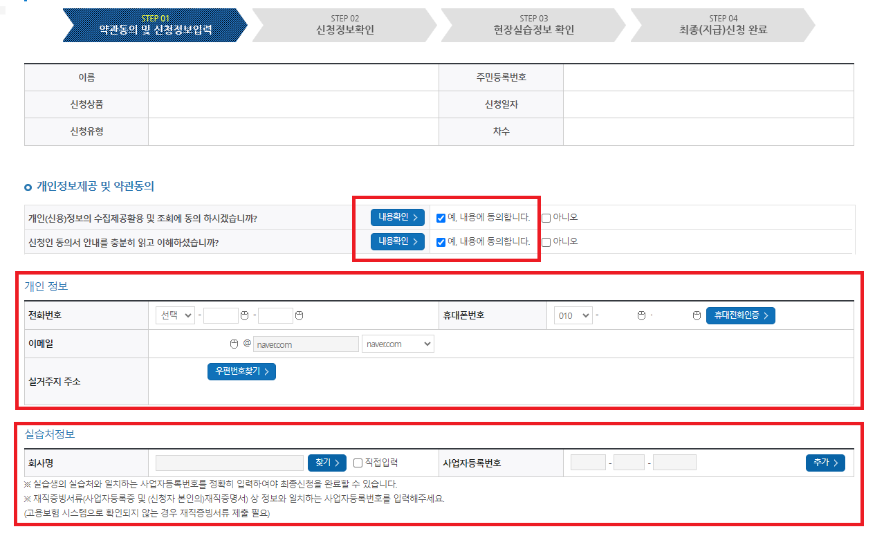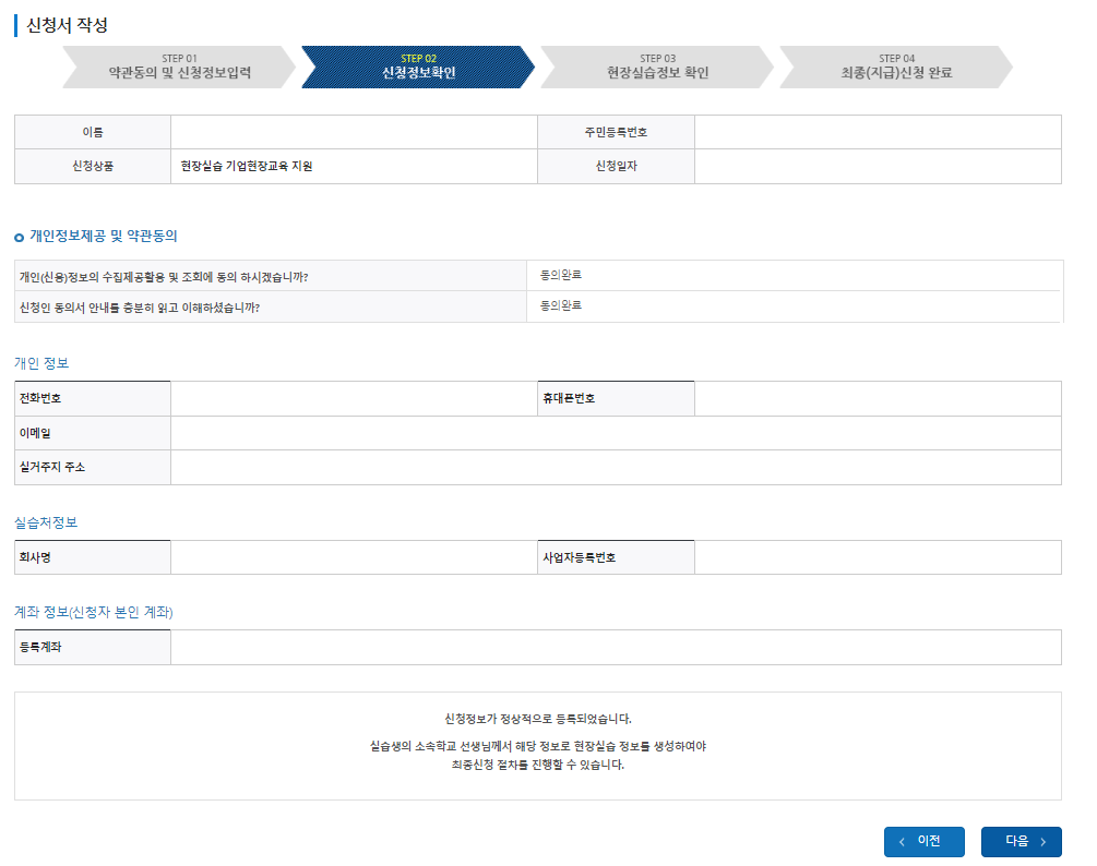 개인정보제공 및 약관동의, 개인정보, 실습처정보, 계좌정보를 입력해야 합니다.