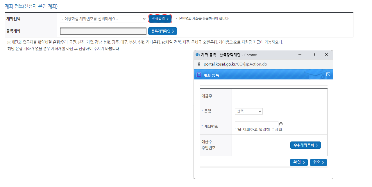 등록된 계좌가 없으면 신규입력을 눌러 본인계좌를 등록해 주면 됩니다.
