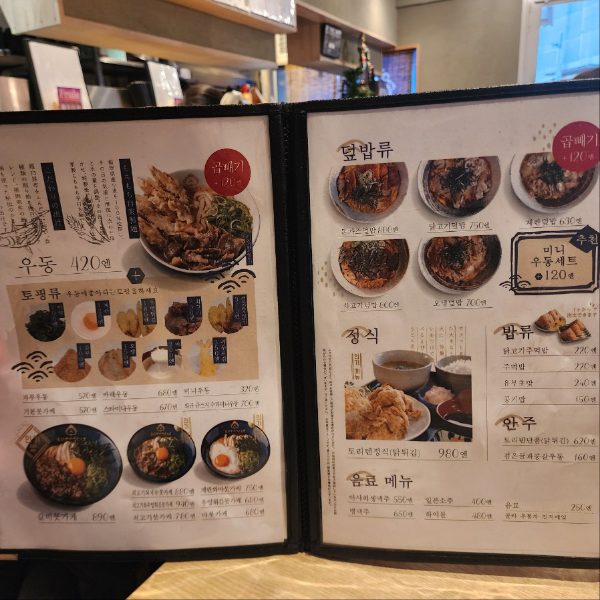 에비스야우동메뉴는 우동과 덮밥류, 밥류가 있습니다.