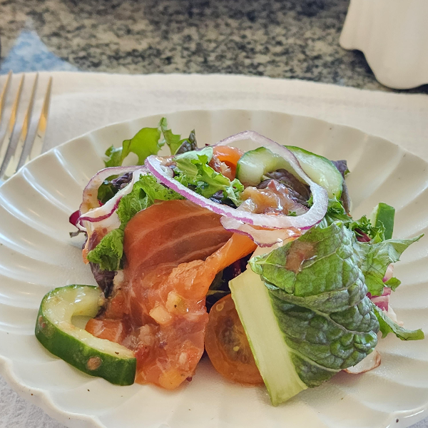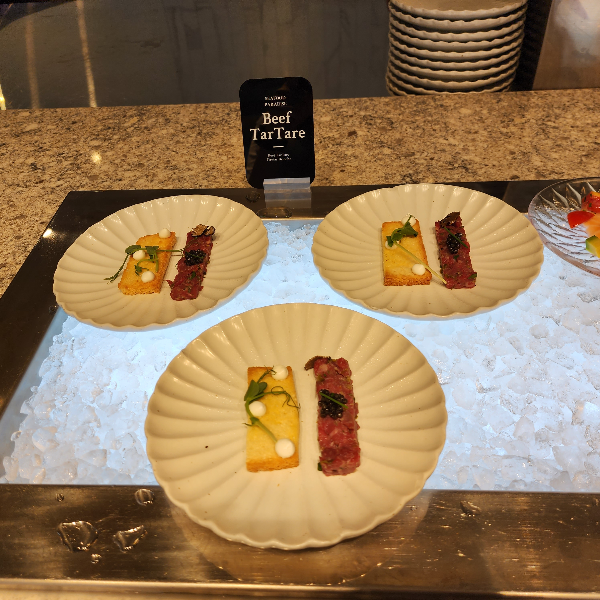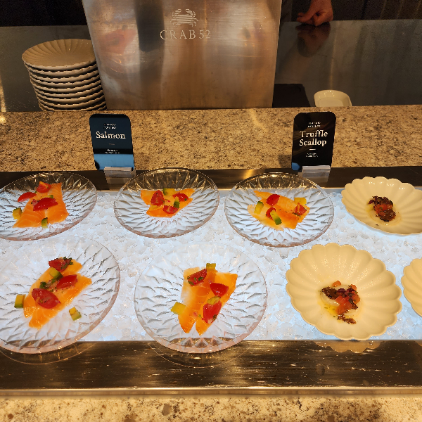 음식에 대한 총평을 먼저 말씀드리면 맛있는 건 맛있고, 맛없는 건 없지만 평범해요. 맛있거나 평범합니다. 다 먹으면서 다 맛있다는 느낌은 없었어요. 그래서 나중에는 맛있는 것만 먹게 됩니다. 애피타이져로 가져온 음식은 대체적으로 평균적으로 맛은 있었습니다. 샐러드 같은 경우 소스랑 연어가 있는 게 좋았습니다.
