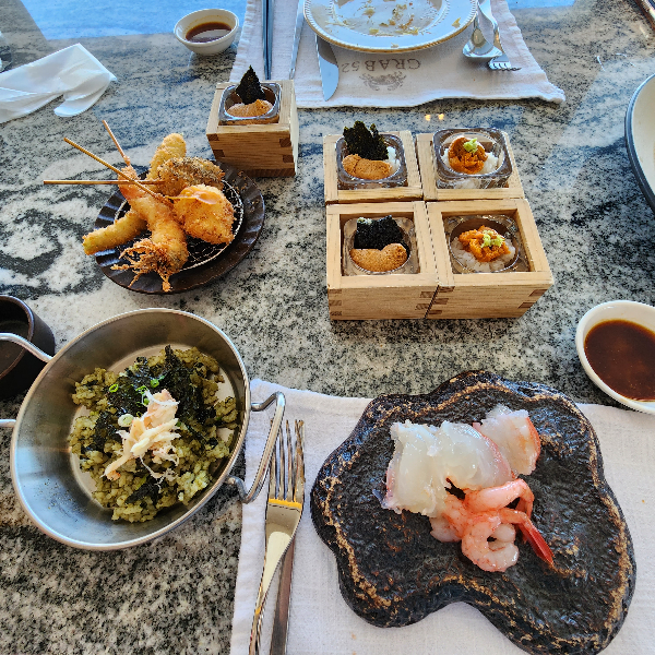 한번 그릇을 정리한 후에 또 음식을 가져오기 했는데, 우니와 단새우, 랍스터 회를 가져왔어요. 랍스터 회는 평소에 못 먹으니 간 이때 뽕 봅을려고 여러 번 가져오긴 했는데, 많이 먹어야 2마리밖에 못 먹었어요. 가져온 양을 따져보면요. 나중에 저처럼 단새우랑 우니 좋아하시는 분들은 그냥 우니랑 단새우만 가져오실지도 몰라요. 그리고 대게 먹고 나면 내장 볶음밥 시켜먹잖아요? 딱 그 맛이 나는 대게장 빠에야가 있었는데, 이거 진짜 추천합니다. 맛있습니다. 내장 맛이 나나도 안 나고 대게집 가서 밥 먹고 먹는 맛입니다. 처음부터 드시지 말고 거의 배 차기 직전에 2번 먹는 거 추천드립니다.
