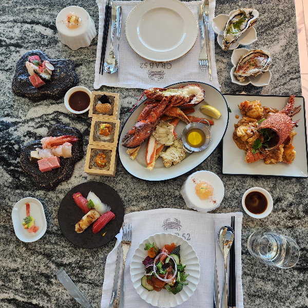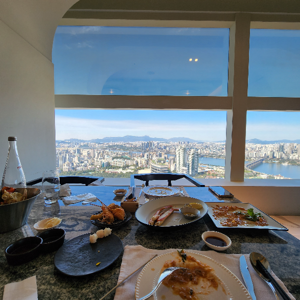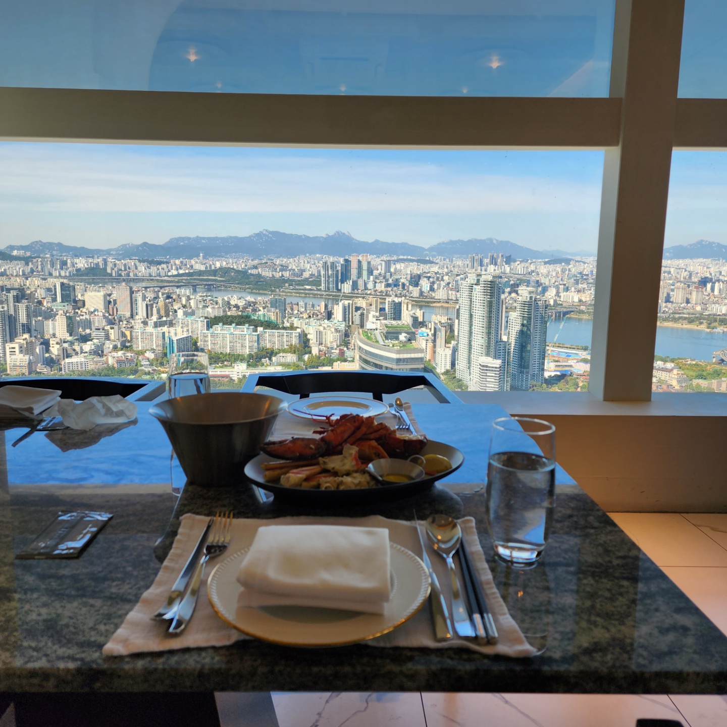 크랩 52 가기 2주 전에 예약해서 창가 자리는 바라지도 않았어요. 창가 쪽은 미리 예약하지 않으면 힘들다고 했는데, 창가쪽 7번 배정을 받았고 뷰는 정말 좋았습니다. 52에서 밥 먹는 기분이 생각보다 너무 좋더라고요. 왜 사람들이 높은 곳으로 이사 가고 싶어 하는지 알았어요. 낮도 좋은 것 같고 밤에 가도 정말 뷰는 멋있을 거 같지만, 처음이자 마지막으로 방문할 곳입니다. 재방문은 누가 사주지 않는 이상 안 갈 것 같습니다.