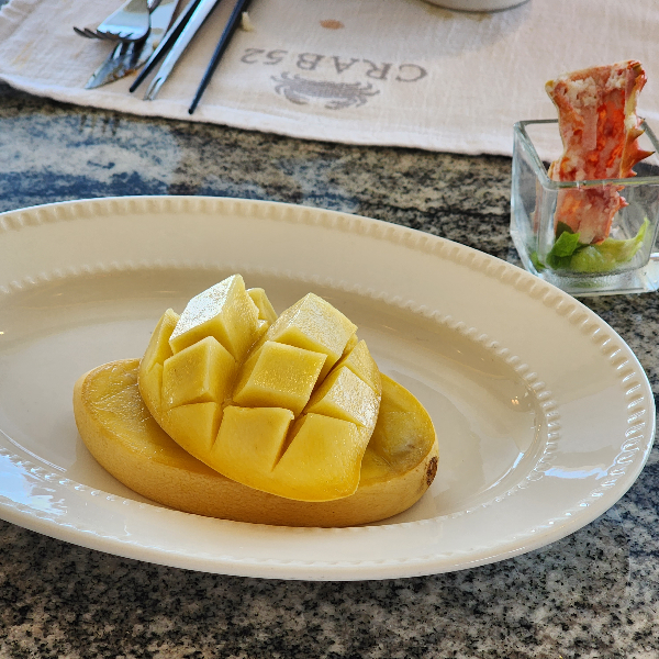 크랩 52 과일은 솔직히 별로 없어요. 망고 엄청 먹을 예정이었는데 맛은 없었고, 특히 사진 보시면 아시겠지만 쪽 나간 거 보이세요? 저 정도면 직원들도 인지하고 손님한테 안 주는 게 예의라고 생각하는데 그냥 주시더라고요. 음식을 받아보면 쪽이 나간 게 은근히 많아요. 근데 그럼 접시를 체크하지 않고 매일 손님한테 음식을 담아 제공한다는 게 매우 어이가 없습니다. 컴플렌인 건다고 당연히 음식값 환불은 못 받을 거 알았고, 죄송하다는 사과도 없어요. 그냥 당당함. 그리고 먹으면서 조금 화가 났던 건 음식을 욕심을 내서 먹어도 안되지만 그래도 내가 망고 같은 건 여러 개 먹을 수 있으니깐 2개 달라고 했는데, 망고 1개를 잘라서 2개를 만들어서 주시더라고요. 그래서 귀찮아도 그냥 망고 먹고 싶은 사람이 여러 번 움직였습니다.