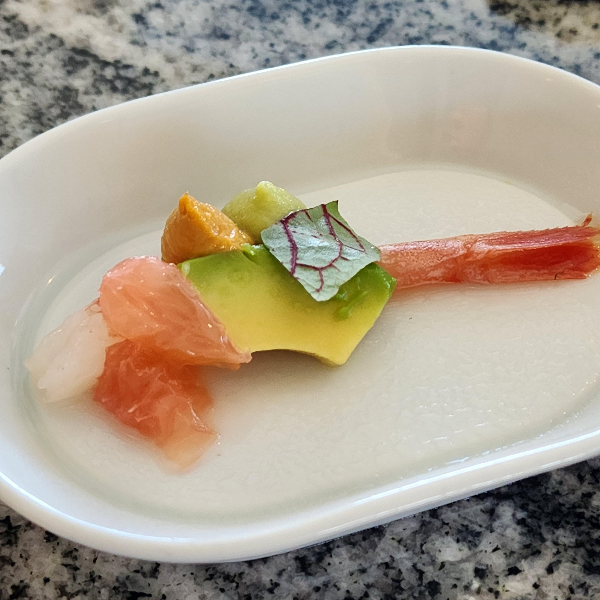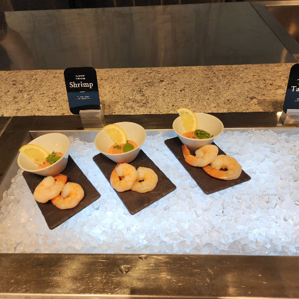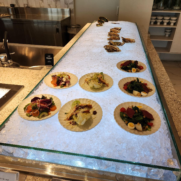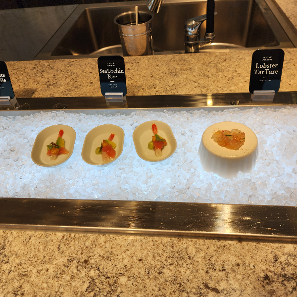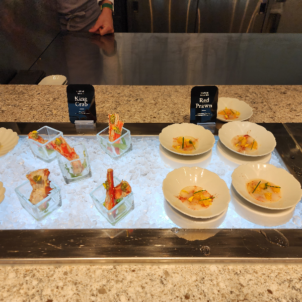 랍스타 찜을 받아놓고, 매장 이곳저곳 다니면서 먹고 싶었던 메뉴들을 보면서 테이블 번호 부르고 다녔어요. 음식을 거하게 먹기 전에 샐러드 같은 애피타이저로 뭐 먹을까 고민을 하다가, 샐러드랑 랍스터 회랑 단새우를 택해서 가져왔습니다.