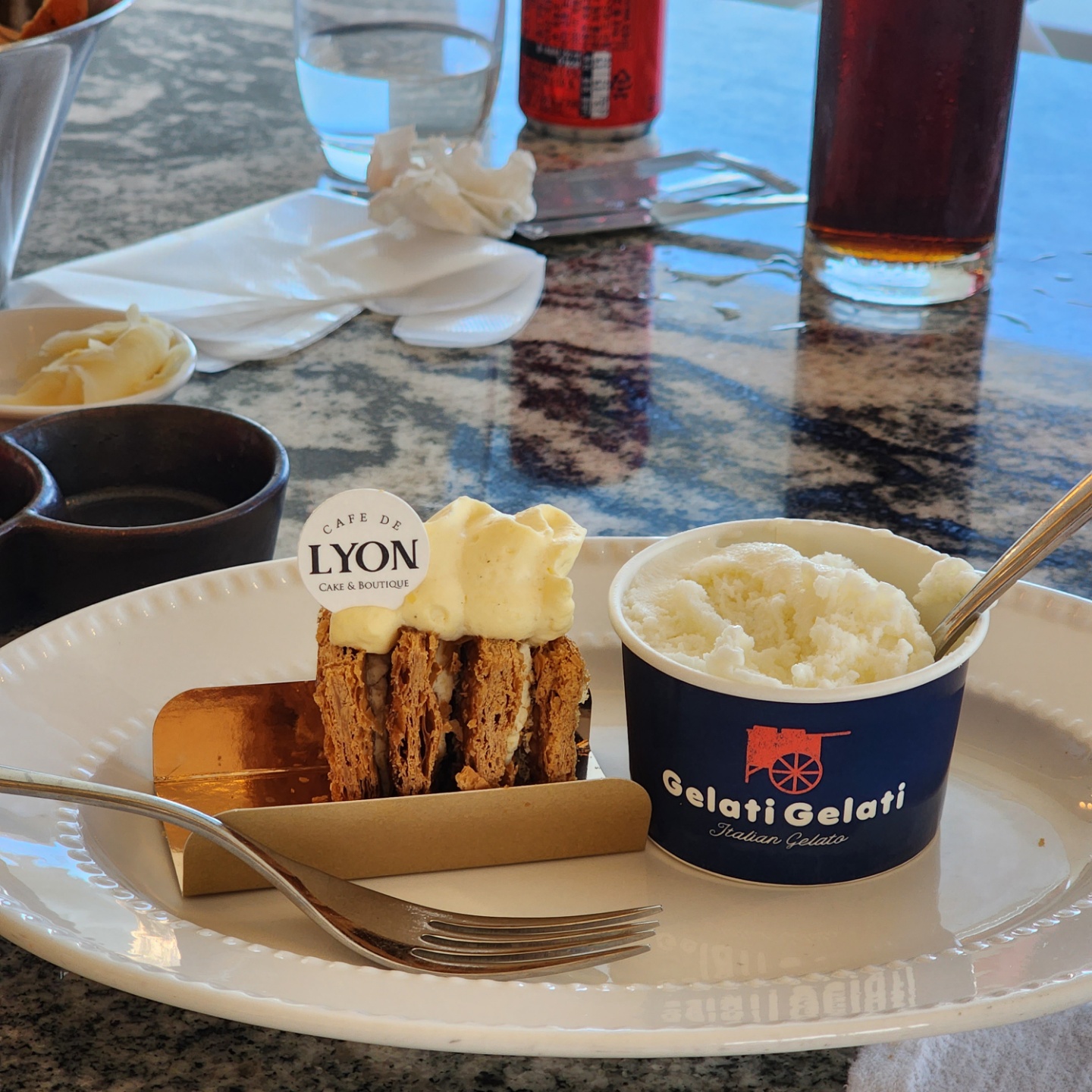 젤라또 아이스크림은 딸기 한번 이천쌀 한번 해서 총 2번 먹었습니다. 딸기 먹으면 입이 약간 개운해지고 이천쌀은 시원하게 밥을 먹는 듯한 기분입니다. 젤라또는 무난하게 맛은 괜찮습니다. 그러나 디저트 맛집으로 유명하다는 카페 드 리옹에서 만든 밀푀유는 솔직히 기대를 많이 하고 갔는데, 맛은 없었습니다. 눅눅하고 바닐라맛이긴 한데 무슨 맛인지 모르겠어요. 그래서 한입 먹고 안 먹었어요.