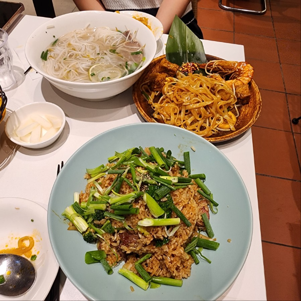 2명이서 주문한 메뉴는 소고기 쌀국수 쉬림프 팟타이, 소고기 후추 볶음밥, 짜조를 주문했어요.