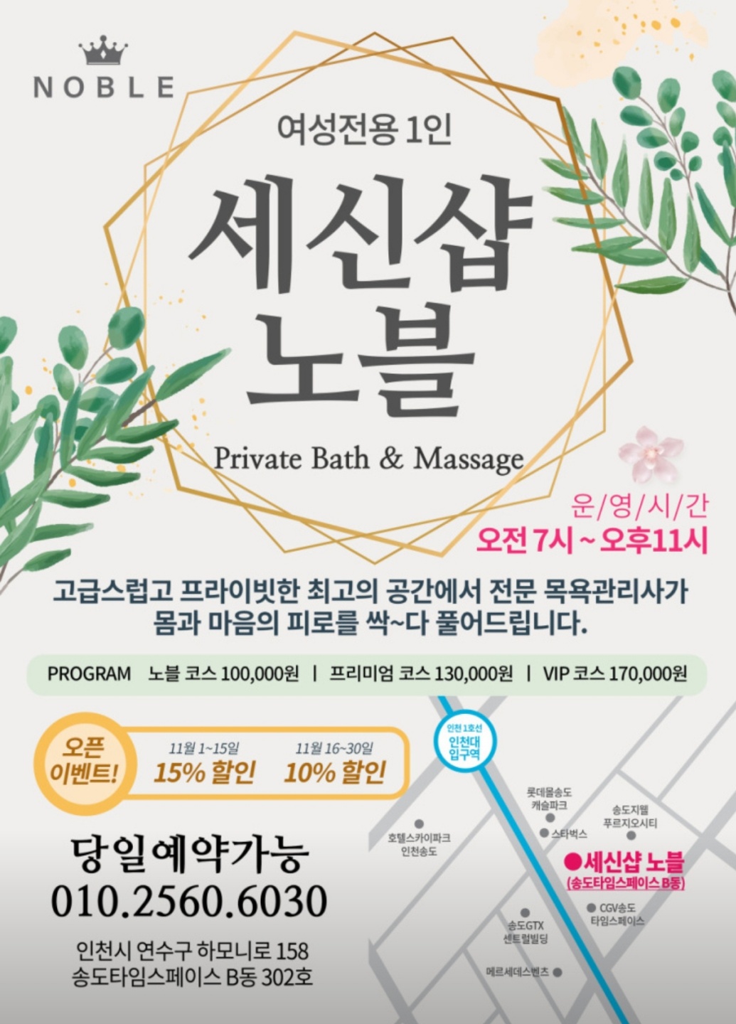 출근길에 송도 1인 세신샵 노블이 생겼다는 광고를 보게 되었습니다.