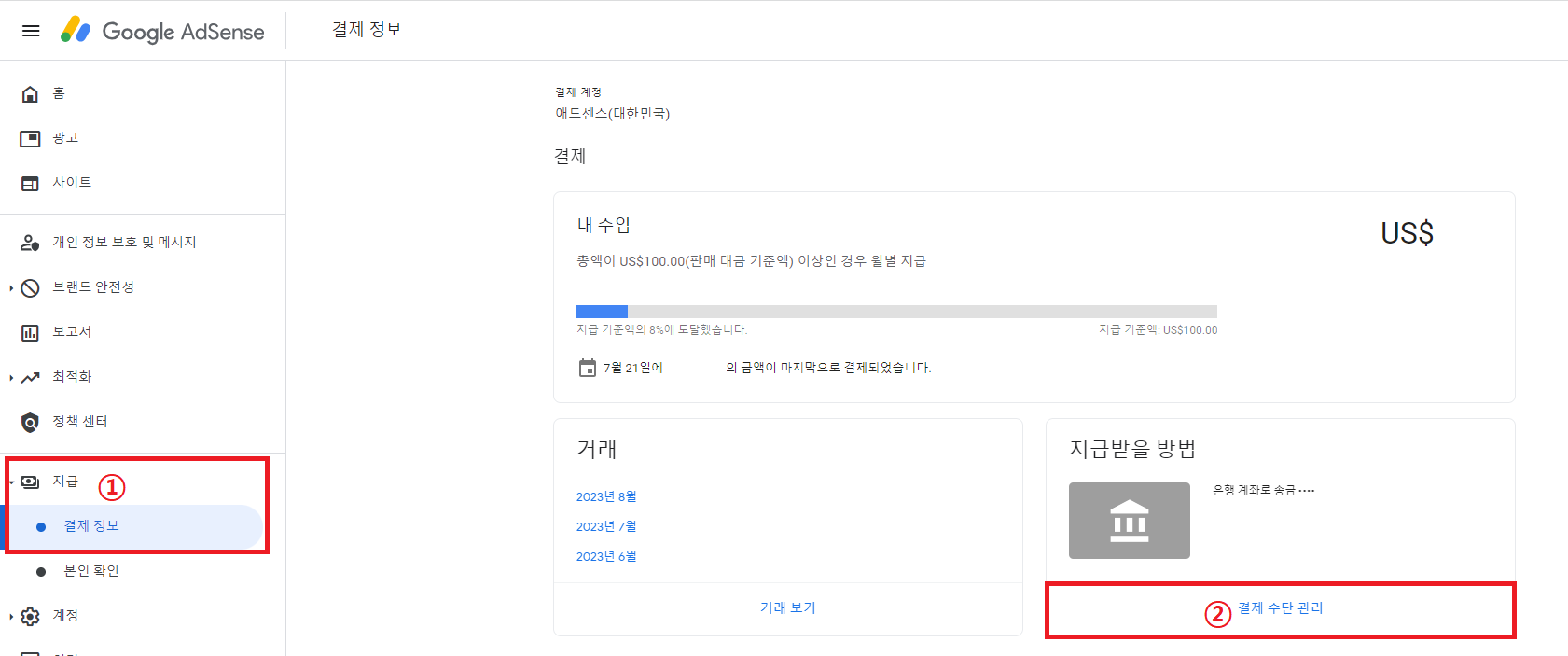 그리고 나서 '지급받을 방법'에서 결제 수단 관리를 선택해줍니다.