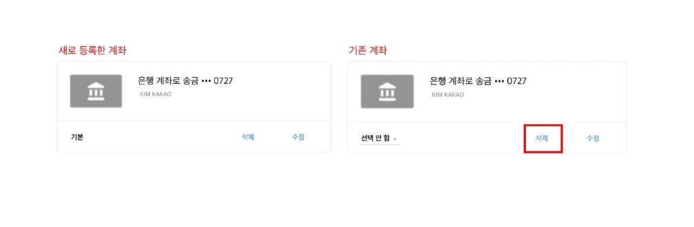 만약 결제 수단 추가 자리에 기존 결제 계좌가 있다면 삭제를 삭제를 눌러주면 코드 변경이 완료 됩니다.