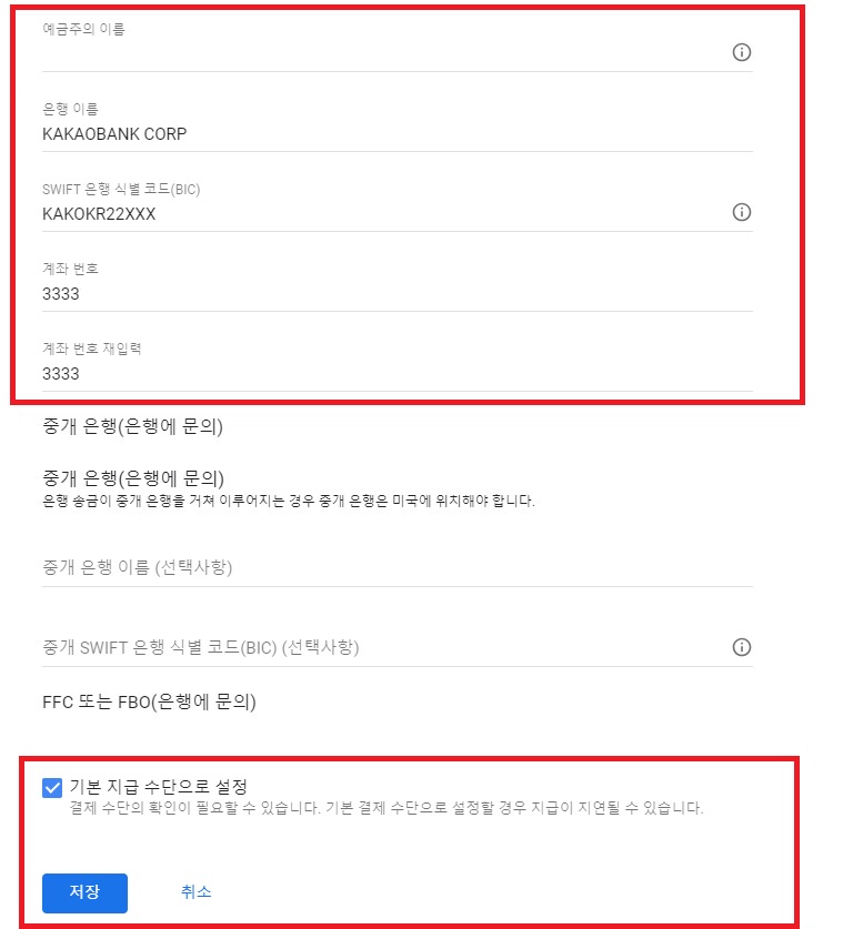 예금주의 이름, 은행이름, SWIFT 은행 식별 코드, 계좌번호, 계좌번호 재입력만 해주면 끝납니다.