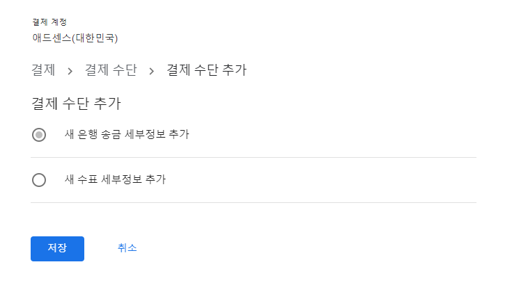 '+결제 수단 추가'를 줄러주면 아래와 같은 화면이 나오며, '새 은행 송금 세부정보 추가'를 눌러줍니다.