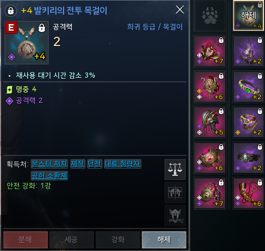 불꽃매 완장은 6강, 크바시르의 결계 견장은 5강, 후긴의 깃털 부적(귀속) 6강, 무닌의 펜던트(귀속) 7강까지 강화했습니다.