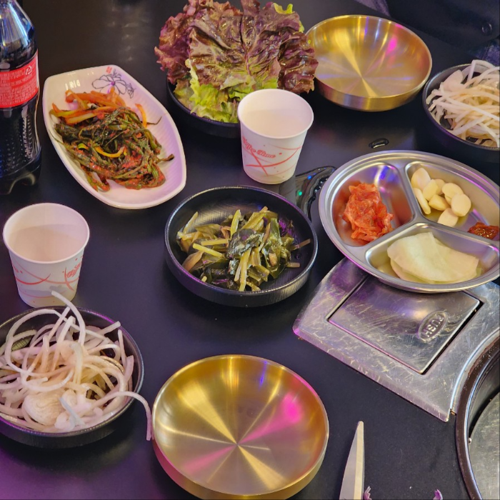 기본반찬에 상추, 파김치, 김치, 명이나물, 양파, 고추, 마늘, 쌈장이 있습니다.