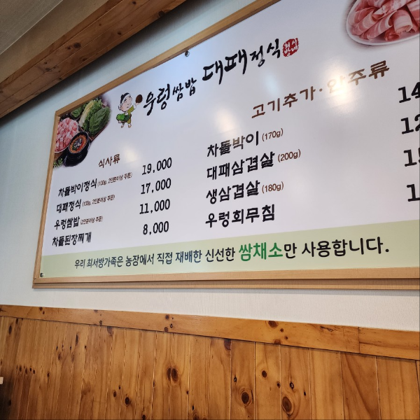 식사류는 차돌박이정식, 대패정식, 우렁쌈밥, 차돌된장찌개가 있습니다.