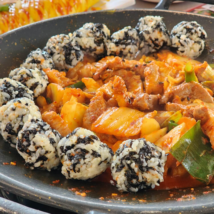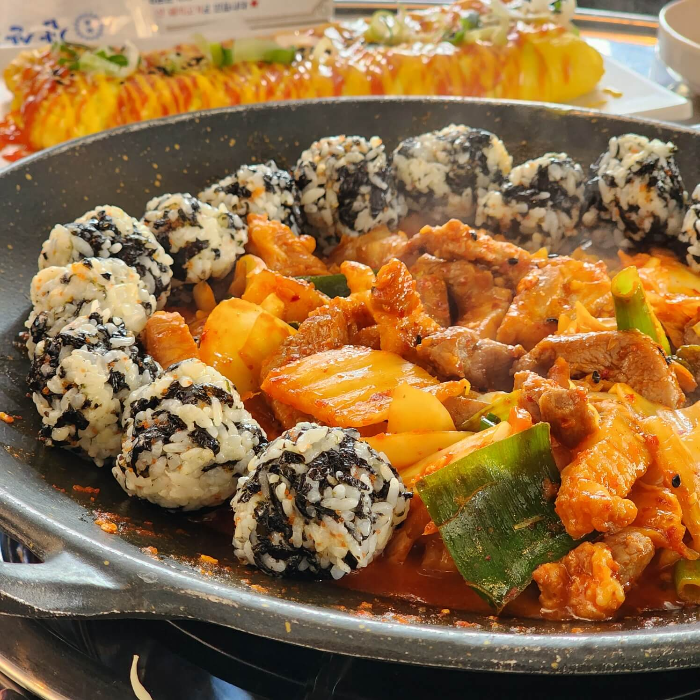 삼산회관에서 주먹밥은 예쁘게 만들어서 돼지김치구이 테두리에 올려주는 게 포인트입니다.