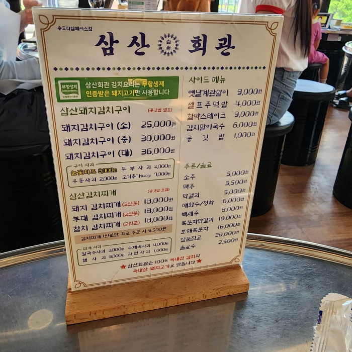 삼산회관 메뉴는 삼산돼지김치구이, 삼산김치찌개와 사이드메뉴가 있어요.