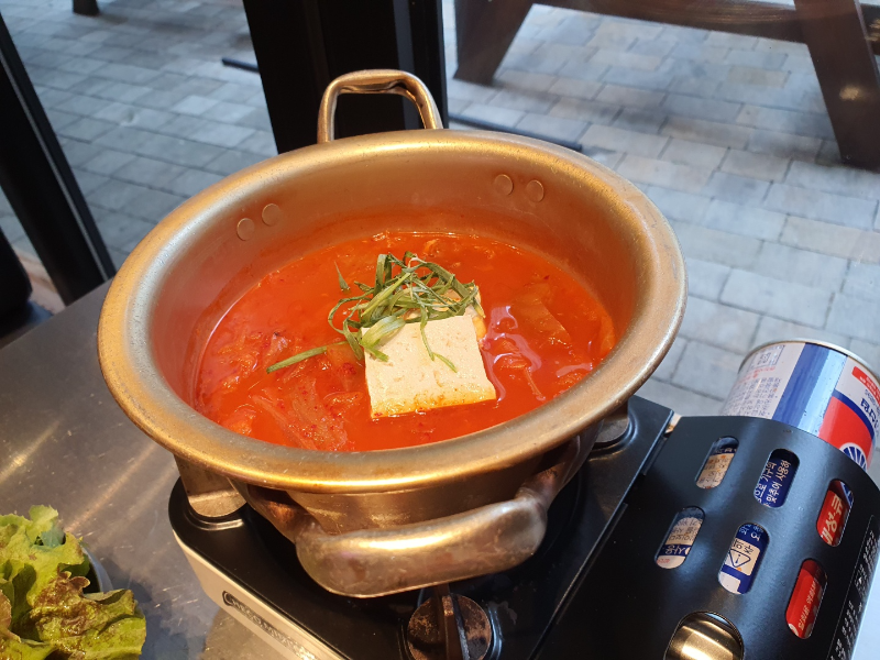 처음에 봤을 때 물이랑 김치 넣고 끓인줄 알았는데, 나중에 국물 맛보면 삼겹살 넣고 끊인 김치찌개 맛났습니다.
