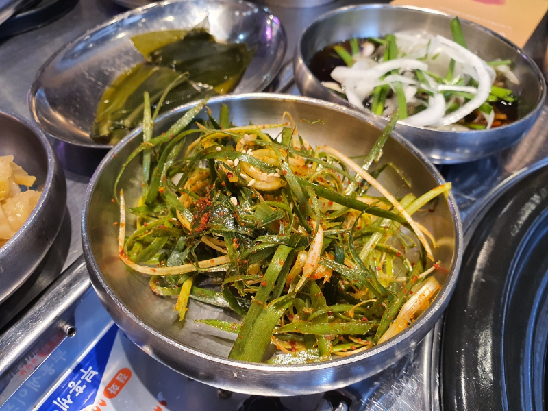 기본반찬은 많이 나오진 않아요. 파채, 양파, 명이나물, 묵은지 끝입니다.