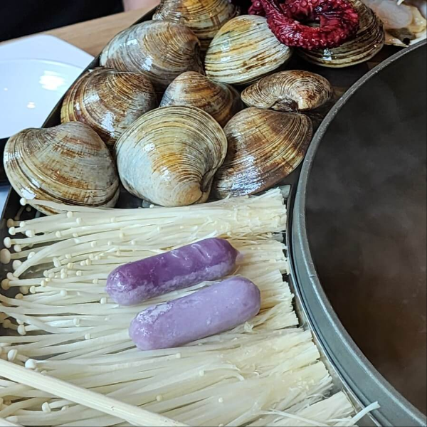 3. 꽃쟁반 위에 있던 조개와 해산물을 모두 냄비에 넣어 5분 정도 끓여줍니다.