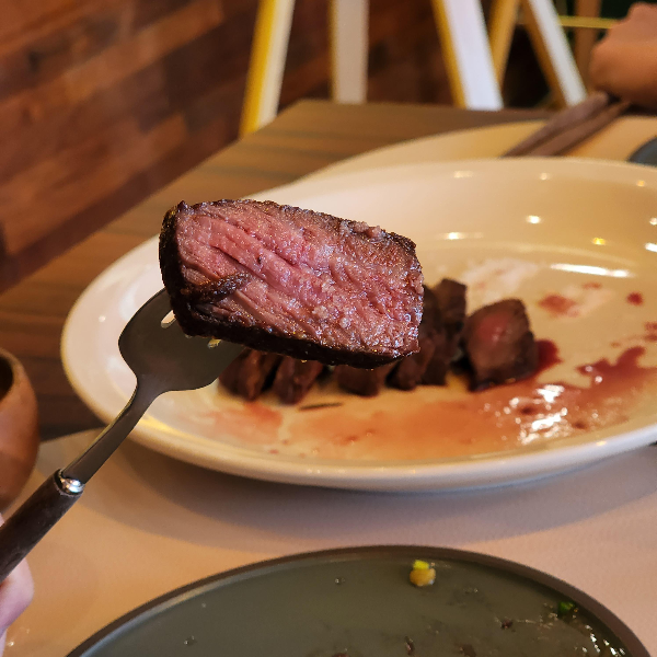 소스는 4가지 주는데, 그중 3가지는 소금이에요. 저는 트러플을 개인적으로 너무 좋아해서 트러플 소금에다가 찍어 먹었을 때가 좋았어요. 고기 굽기는 미듐 웰던으로 했어요. 핏물도 살짝 흐르고, 안쪽에는 빨개서 먹기 좀 부담스러웠는데 막상 또 먹으니깐 맛있더라고요. 거기다가 트러플 소금에 찍어 먹으니깐 트러플 향이 입안에 돌면서 맛있었어요.