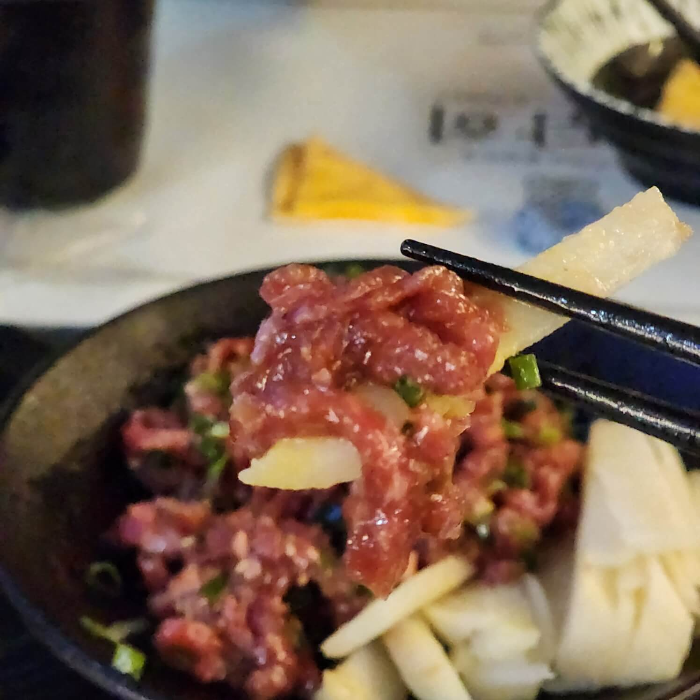 옛날에 당진에서 소고기타다끼를 너무 많있게 먹어어가지고 그 집만큼 맛있는 곳이 없긴 하지만, 그래도 양파랑 소스랑 같이 해서 찍어 먹으니깐 육사시미 같은 느낌은 없었어요.