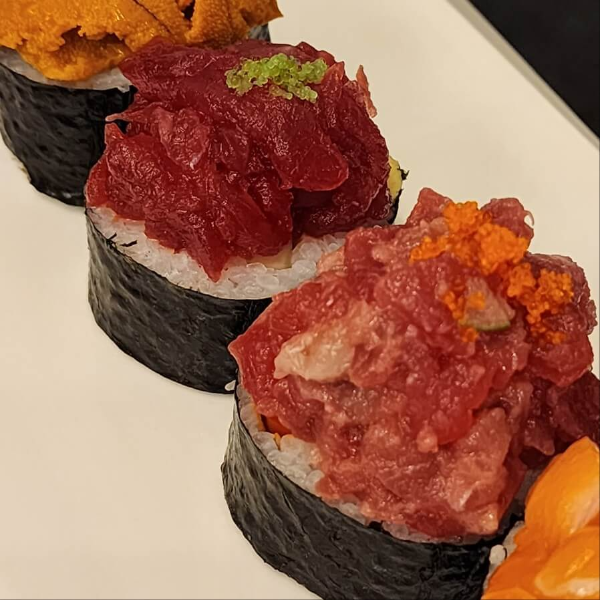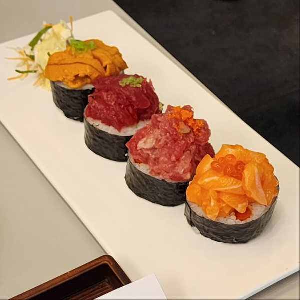 후토마끼 위에 올라 간 우니, 참치, 연어입니다.