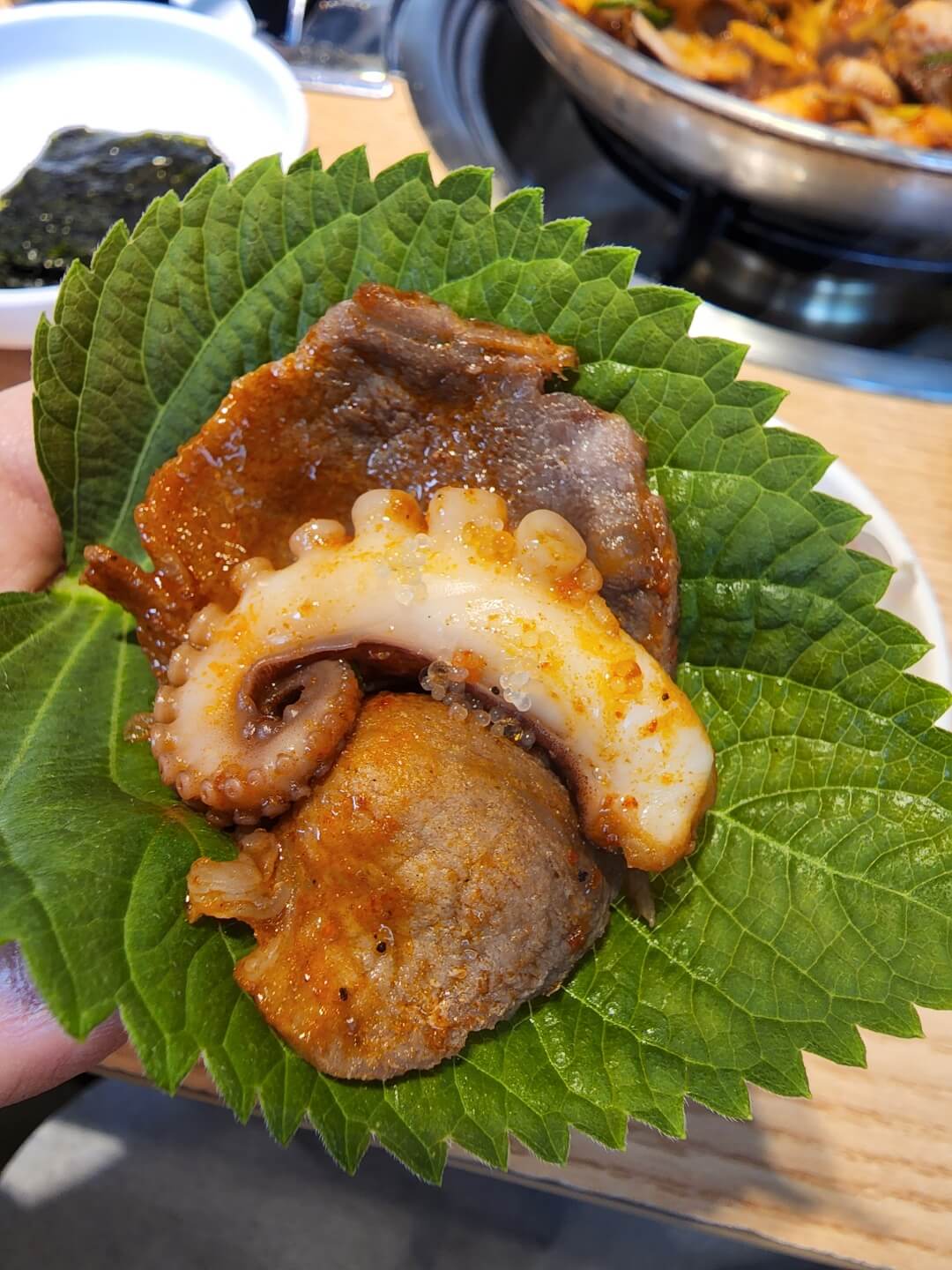 우선 깻잎을 위에 삼겹살과 쭈꾸미를 올려줍니다.