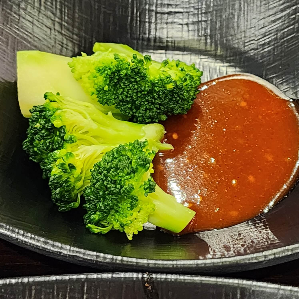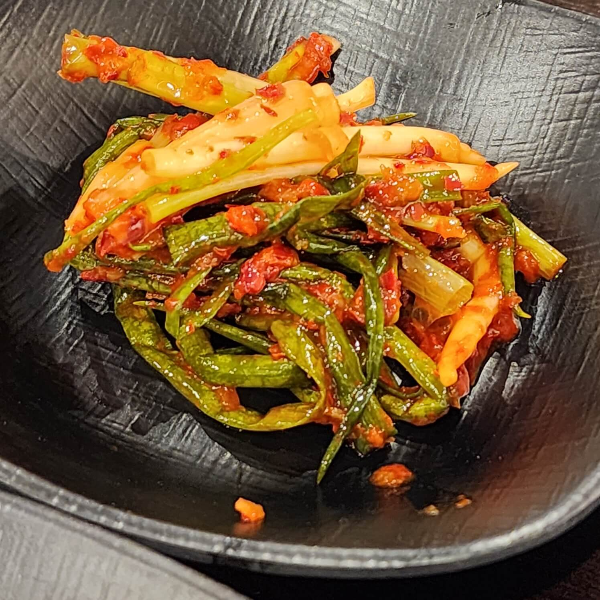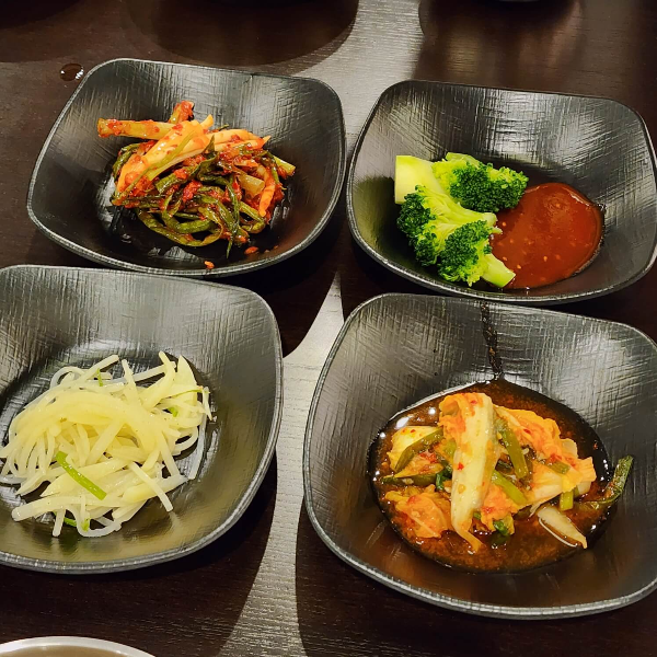 주문 후에 나오는 반찬은 파김치, 브로콜리, 열무김치, 감자채볶음인 것 같습니다.