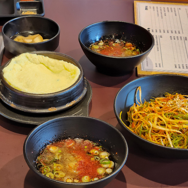 주문하자마자 기본으로는 나오는 반찬은 계란찜, 파채랑 각 개인 양념소스장이 나와요. 그리고 삼겹살 기름에 굽는 김치, 고사리, 콩나물, 미나리가 나옵니다.