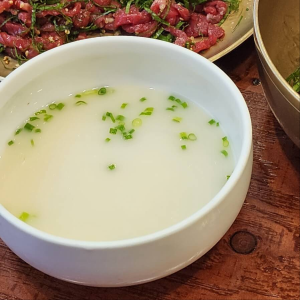 육회비빔밥 주문 시 주는 육수인데, 뼈우려낸 사골느낌 나는 맛입니다.