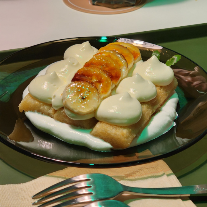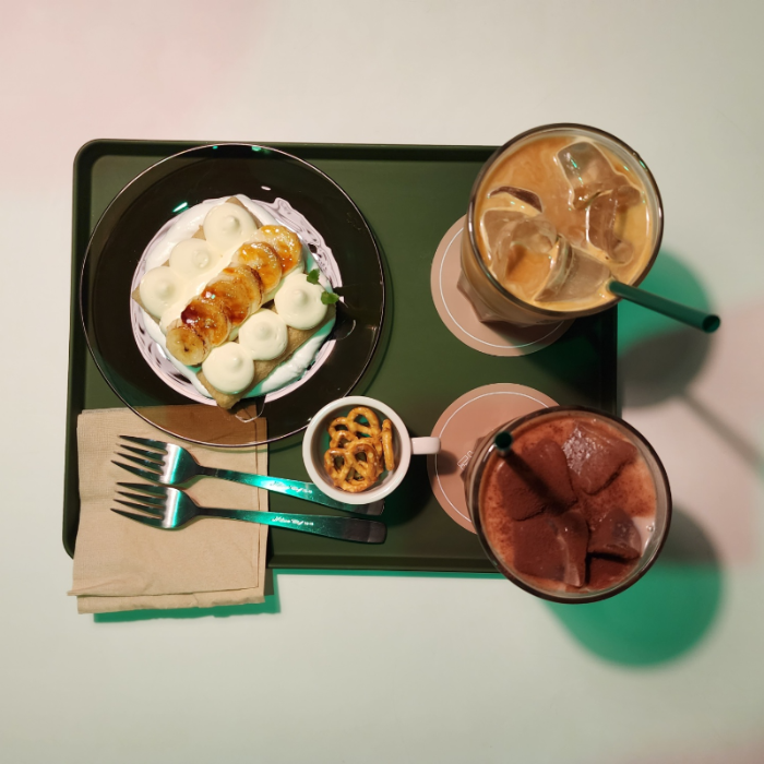 저는 바삭 바나나 티라미수와 음료는 발로나 초코라떼를 주문했습니다.