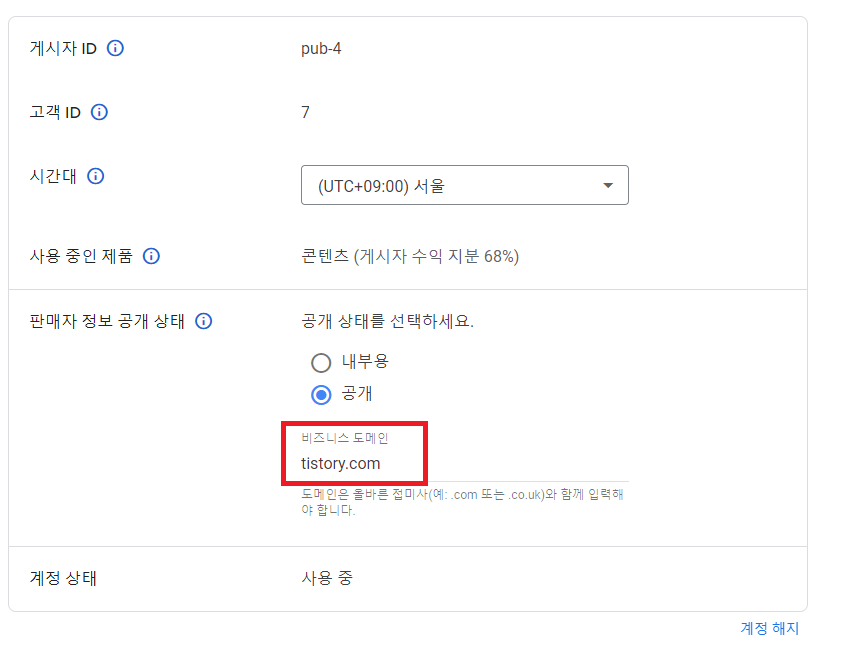 공개 상태를 내부용에서 공개로 변경해주시고, 비즈니스 도메인에 tistory.com라고 입력해주시면 끝납니다. 저장버튼이 따로 없기 때문에 바로 tistory.com라고 입력해주시면 '변경사항이 저장되었습니다' 라고 검은색 박스가 나오면서 자동 저장이 됩니다.
