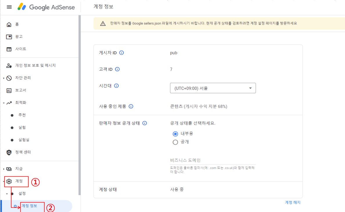 구글 애드센스 계정에 로그인후 톱니바퀴 모양 '계정'을 눌러주세요. 바로 '계정정보'가 보이시는 분들도 있으시겠지만, 그렇지 않은 경우에는 중간에 보이는 설정을 눌러주시면 계정정보가 나와요. 그럼 본인 계정의 게시자 ID, 고객 ID가 입력이 되어 있습니다.