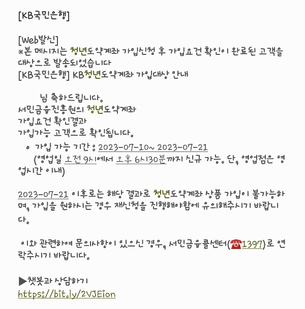 KB 국민은행으로 신청했기 때문에, 국민은행 신청결과가 문자로 안내됩니다.