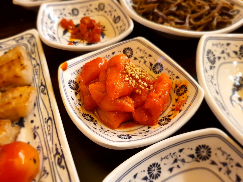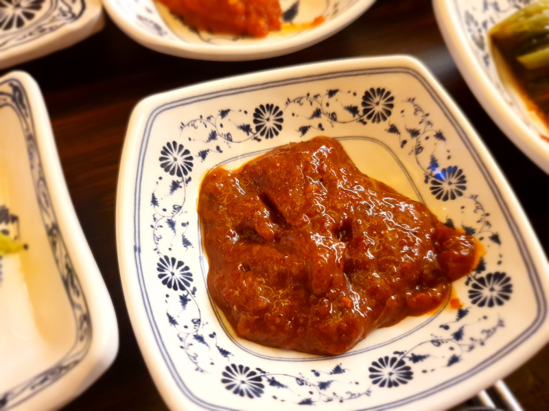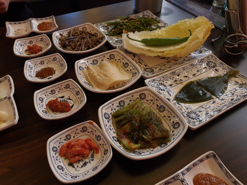 기본적으로 고사리, 배추, 명이나물, 묵은지, 부추무침, 갓김치와 젓갈 종류를 3가지 정도 주는 것 같아요