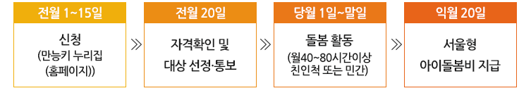 그리고 조부모 또는 민간 돌봄 서비스를 이용 달에는 정부에서 지원하는 아이 돌봄 서비스 중복으로 이용할 경우 돌봄비 지원불가입니다.