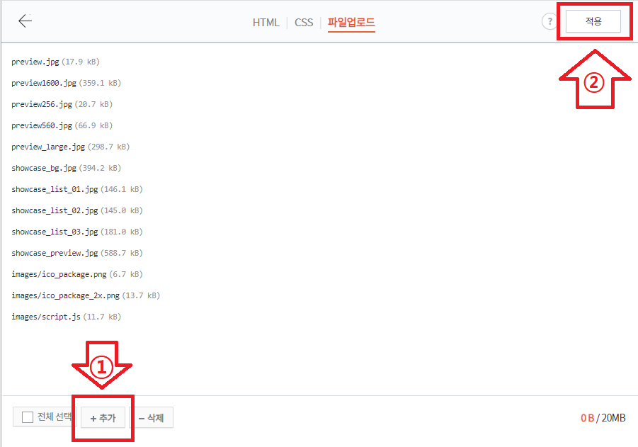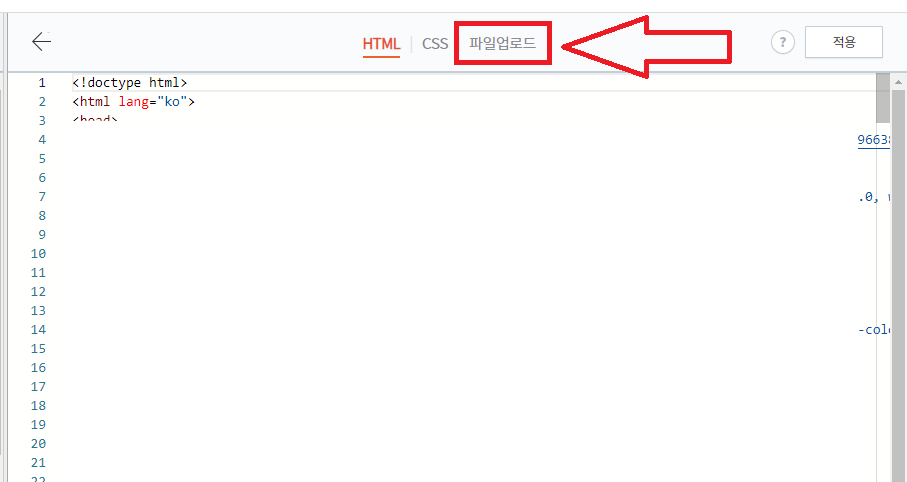 파일업로드를 누르면 처음에 알지 못하는 코드로 나열되어 있어서 당황하실 수도 있을 거 같아요. 절대 코드는 안 건드리시니깐 신경 안 써주셔되고, HTML l CSS l 옆에 있는 '파일업로드'를 눌러주세요.