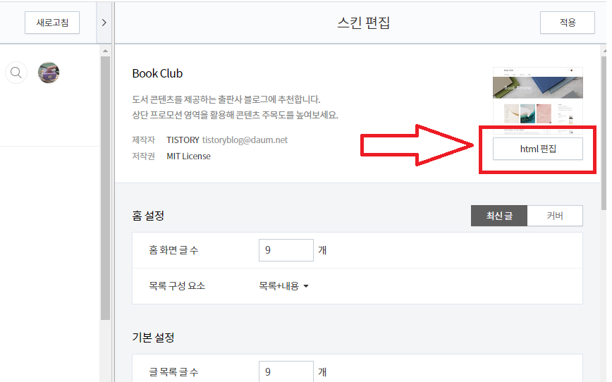 오른쪽 상단 쪽으로 보시면' html편집' 버튼이 있습니다. Book Club스킨, Squar 스킨 등 스킨 종류에 상관없이 스킨 편집에 들어가시면 오른쪽 상단에 있으니 지금까지 보시고 잘 따라와 주시면 됩니다.