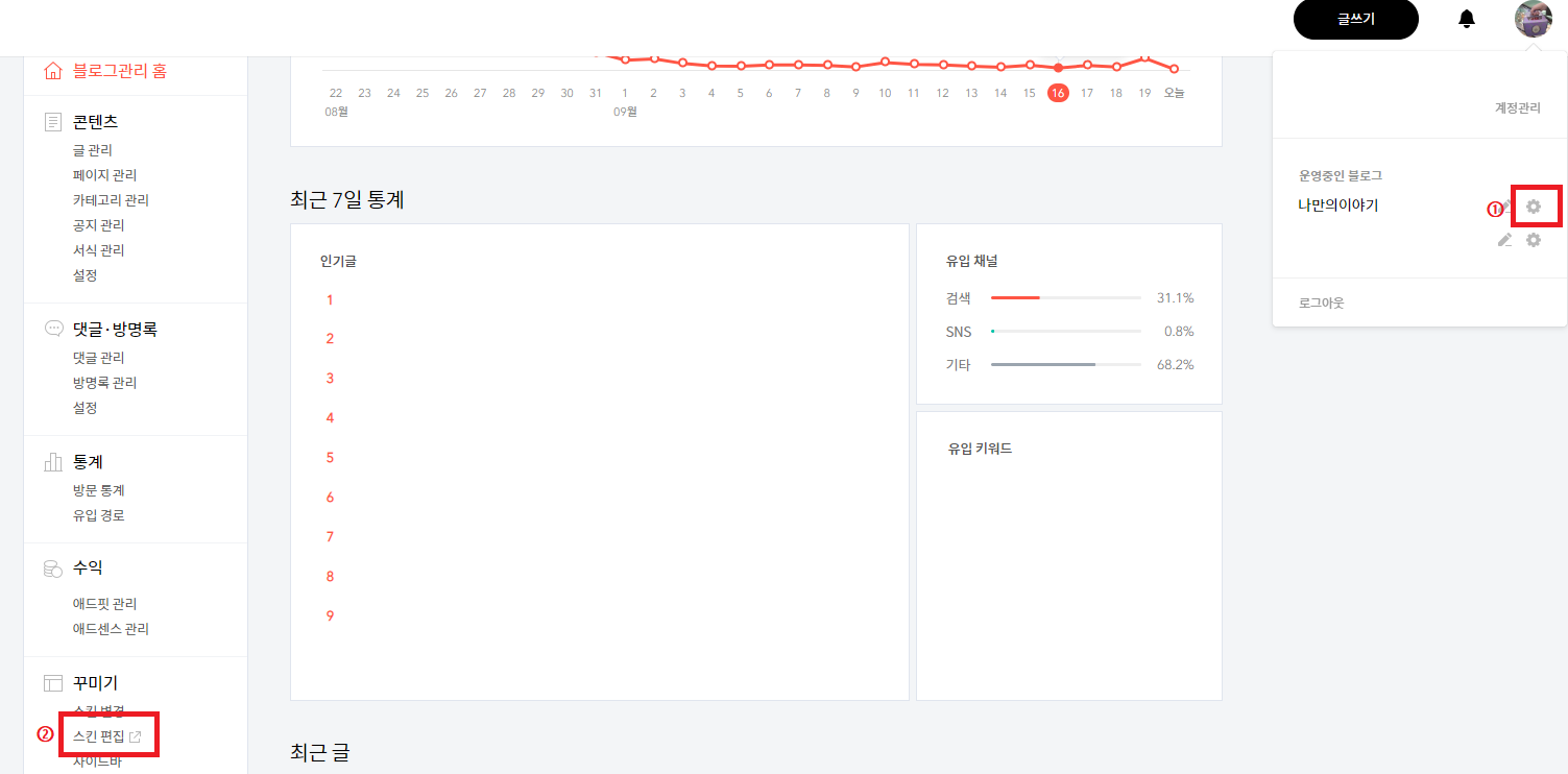 티스토리 '스킨 편집' 들어가시는 방법은 대부분 다 아실 겁니다. 관리로 바로 들어가셔도 되고, 저처럼 오른쪽 상단에 프로필 사진을 누르면 톱니바퀴 모양을 누르고 스킨 편집 들어가는 방법이 있으니 참고하셔서 스킨 편집으로 들어가 주세요.