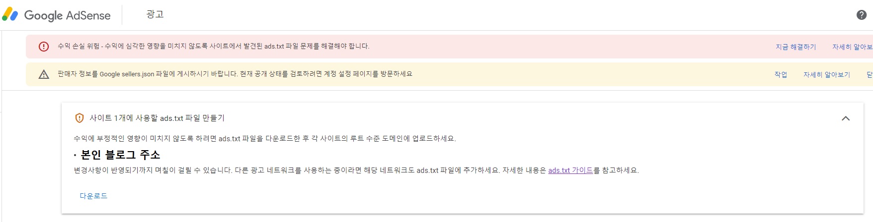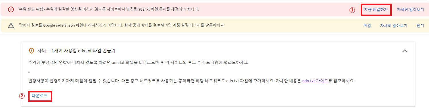 수익 손실 위험 - 수익에 심각한 영향을 미치지 않도록 사이트에서 발견된 ads.txt 파일 문제를 해결해야 합니다.